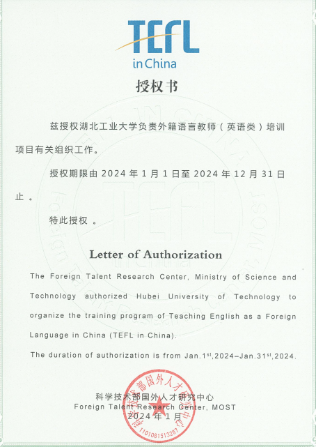 “TEFL中国”是为在华从事英语教学人士提供的职业培训项目。“TEFL中国”武汉中心设立于湖北工业大学。湖北工业大学是“TEFL中国”培训项目在湖北地区唯一授权点,目前也是中南地区唯一的培训中心。