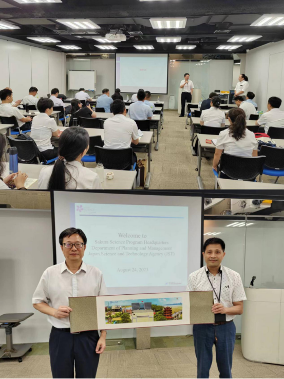随后,代表团一行实地访问了日本科学技术振兴机构(JST),该机构单谷处长介绍了机构相关职责和主要资助项目,重点介绍了与中国科技部合作开展的中日青少年科技交流项目“樱花科技计划”的申报与运行情况。会谈中,蔡光兴指出我校将以“樱花科技计划”为抓手,进一步推动师生团队积极申报中日科研合作项目、开展实地交流学习。单谷表示,日本科学技术振兴机构(JST)将予以积极支持。