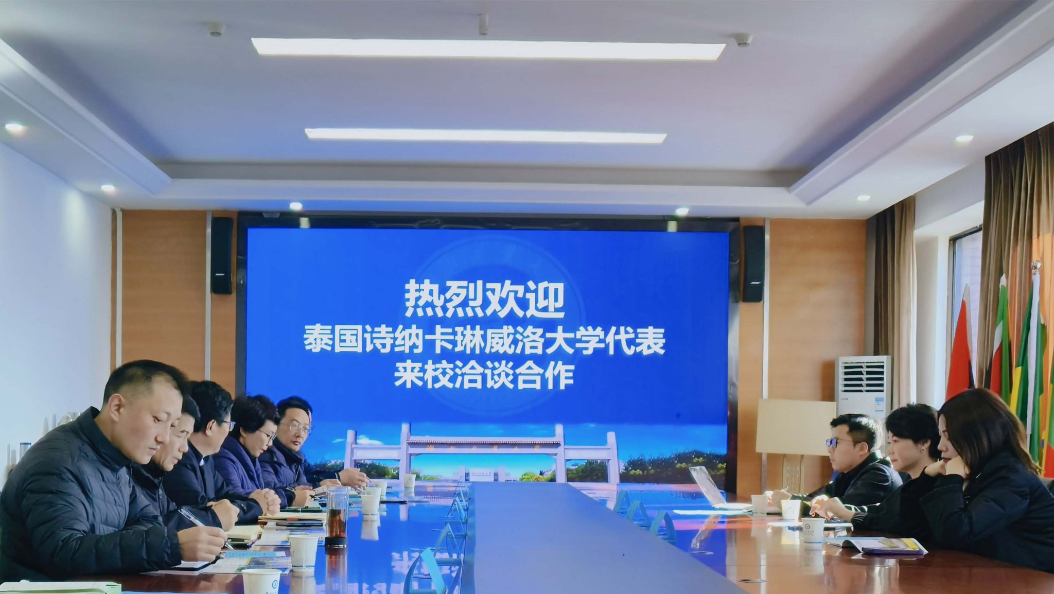 12月19日上午,泰国诗纳卡琳威洛大学湖北办事处主任孙琴一行三人访问我校。合作洽谈会在行政楼四楼会议室举行。校党委副书记蔡光兴出席接待。会议由国际交流合作处副处长洪文琦主持。社会资源处、继续教育学院、工程技术学院等单位负责人参会。