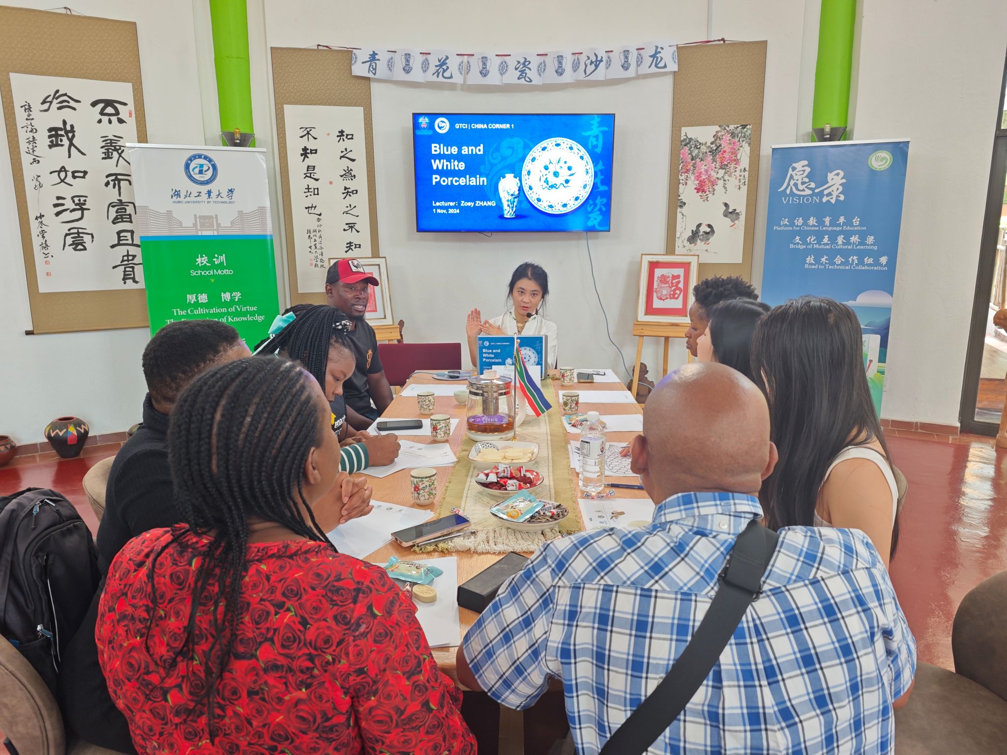 11月1日,GTCI举办了第一场中国角文化沙龙。公派教师张多主持了本场沙龙。她向参与活动的师生介绍了青花瓷的悠久历史、经典纹饰以及它们的象征意义。她通过讲述青花瓷在全球瓷器文化中的重要地位,让活动参与者们对青花瓷的艺术之美和深远影响有了更为直观的认识。在手工活动环节,参与沙龙的师生一起制作了融合中国与南非纹饰风格的青花瓷纸盘画。
