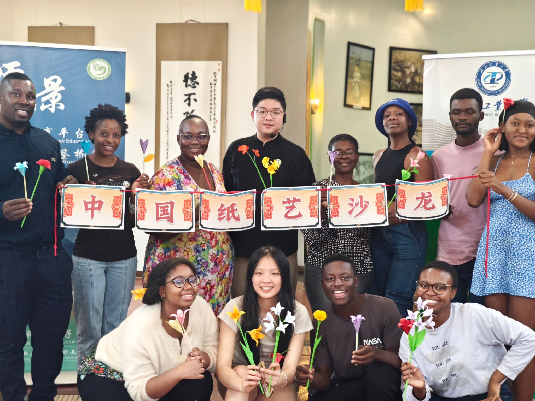 11月15日,绿色科技孔子学院举办了第三场主题为中国传统纸艺的文化沙龙。我校公派教师、孔子学院教学主管熊惟杰主持本场沙龙,向参与活动的文达大学师生展示了中国的造纸历史、用纸文化与纸媒艺术。活动现场布置了各种由孔院教师亲手制作的剪纸与折纸工艺品,装点起浓浓的中国氛围。讲座后,熊老师带领所有参与活动的师生一起动手,制作了一支折纸百合。百合,得名于“百事和合”。在本次沙龙中,熊老师带领大家动手制作百合,正是为了将“和”文化讲入文达师生的内心。中南文明互鉴,民心和谐相通,也是绿色科技孔子学院不懈的追求。