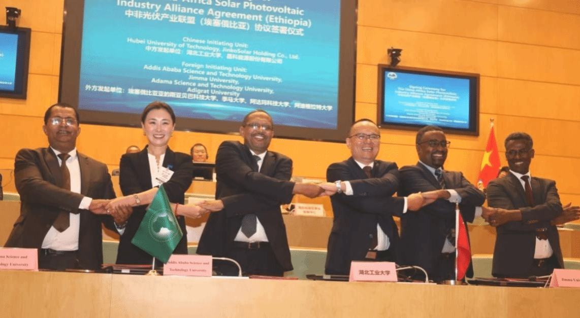 湖北工业大学、晶科能源、亚的斯亚贝巴科技大学、季马大学、阿达玛科技大学、阿迪格拉特大学现场签署《中非光伏产业联盟(埃塞俄比亚)共建协议》,共同发起成立中非光伏产业联盟,实现中非新能源合作从“单个项目”向“产业生态”升级。