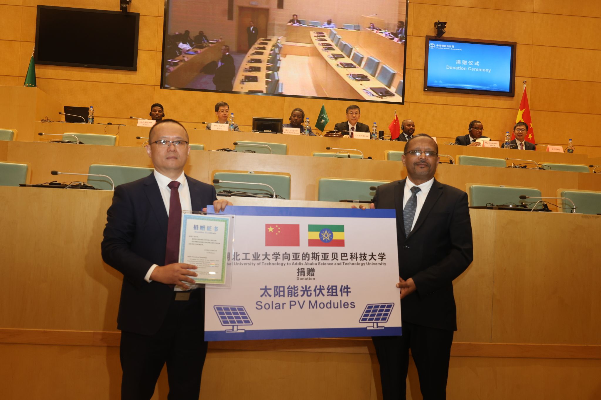 开幕式上,中非创新合作中心向亚的斯亚贝巴环保局捐赠小型太阳能光伏储能电站,该项目由我校曾炜教授团队与晶科能源在亚的斯亚贝巴合作建造。