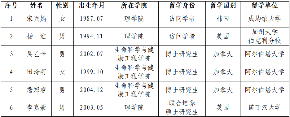 根据国家留学基金委《关于做好2025年创新型人才国际合作培养项目人员申报工作的通知》,经个人申请、所在学院推荐,现将拟申报国家留学基金委2025年创新型人才国际合作培养项目的申请人基本情况公示如下: